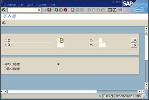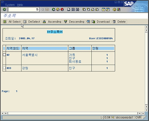 | - 먼저 사용자에게 초기화면에서 지역과 그룹의 값을 입력 받고 주소록 Table인 tkks01로부터 데이터를 발췌하여 주소록 현황보고서를 출력 - 사용자가 하나의 지역과 그룹을 선택해서 더블클릭을 할 경우 주소록 상세내역을 출력 - 첫 번째 화면에서 상단의 User Menu를 선택할 경우 그에 적절한 기능을 수행할 수 있도록 구현 |